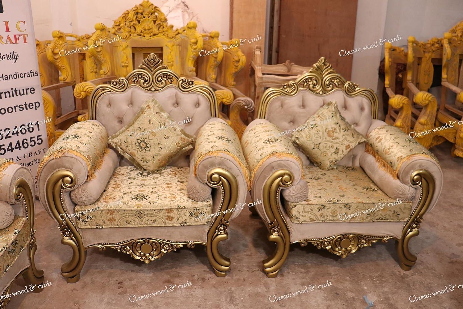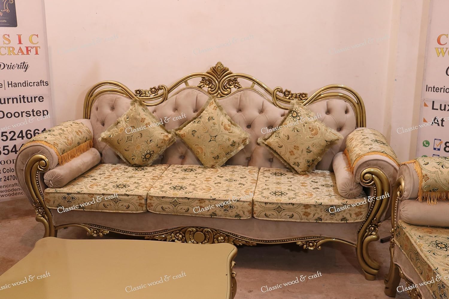 CLASSIC WOOD & CRAFT Introducing our 10 seater luxurious sofa set in golden deco finish. Beautifully crafted sofa that combines both functionality and elegance, designed to enhance your living space in every way possible. At the heart of our sofa’s design is an unwavering commitment to space efficiency. With its thoughtfully engineered dimensions, it effortlessly adapts to various room sizes, making it a versatile addition to homes of all types. Whether you have a cozy apartment or a spacious living room, our sofa seamlessly integrates into your environment. Crafted with the utmost attention to quality, our sofa boosts premium upholstery materials that not only exude a sense of luxury but are also chosen for their durability. The Sofa is designed by professional artisans by Classic wood and craft industry. All the carving & manufacturing work is done by hand only. The Sofa is designed in Teak wood which serves life long as it has termite and fungus resistance properties. The sofa that withstands the test of time, maintaining its plush appearance and tactile comfort for years to come. Traditional with modular design, you can easily rearrange the sofa’s components, creating configurations that cater to gatherings, relaxation, or even solo moments of reprieve. This level of versatility ensures that your sofa adapts to your lifestyle, not the other way around. Sink into indulgent comfort with our high-density foam cushions that cradle your body with gentle support. Whether you’re lounging for hours or enjoying a short respite, our cushions ensure a consistently comfortable experience that rejuvenates you, day after day.