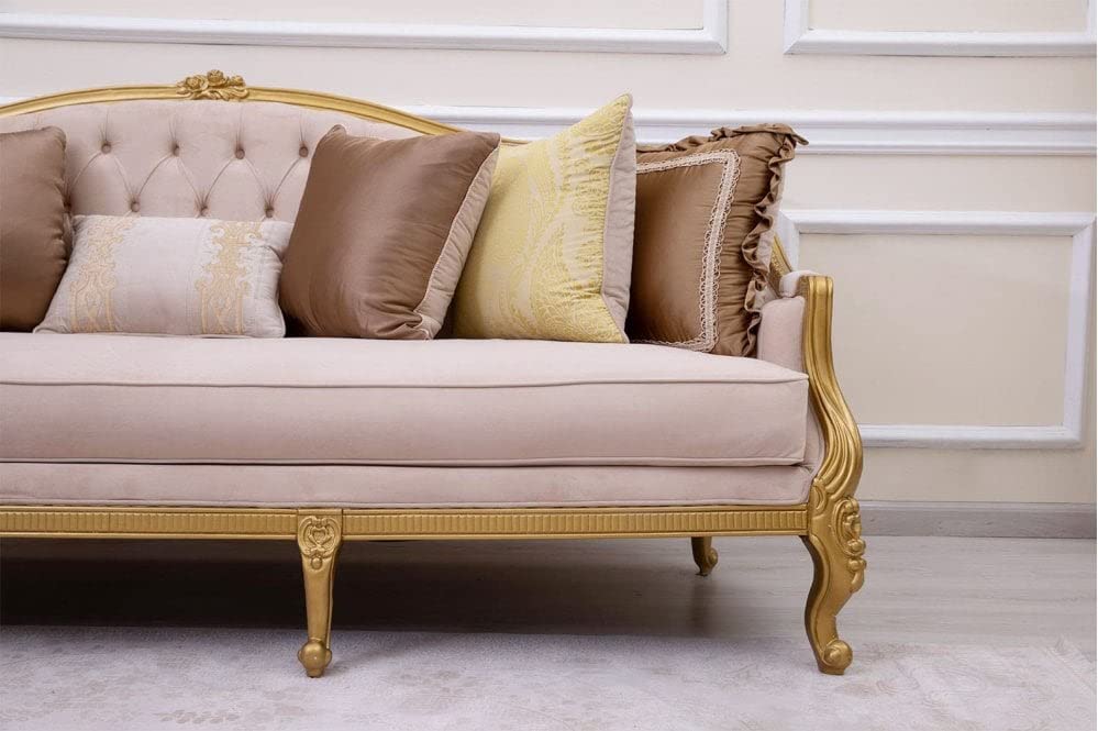 PRIMARY MATERIAL : Soft-Touch Velvet, Frame Material: Solid Teak Sagwan Wood With Carving Work, Legs: Solid Wooden Legs With Golden Finish Polished.