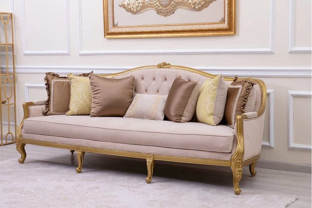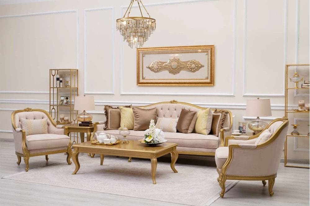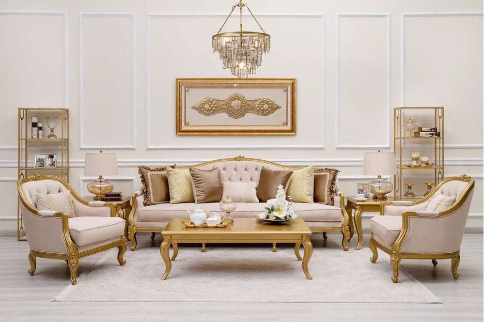 LIFESTYLE GOODS FOREVER LSGF Luxury Design Traditional Buckland Sofa Set Carving with Solid Sagwan Wooden Sofa Set for Small Apartments, Living Room or Bedroom (3+1+1 with Center Table, Beige)