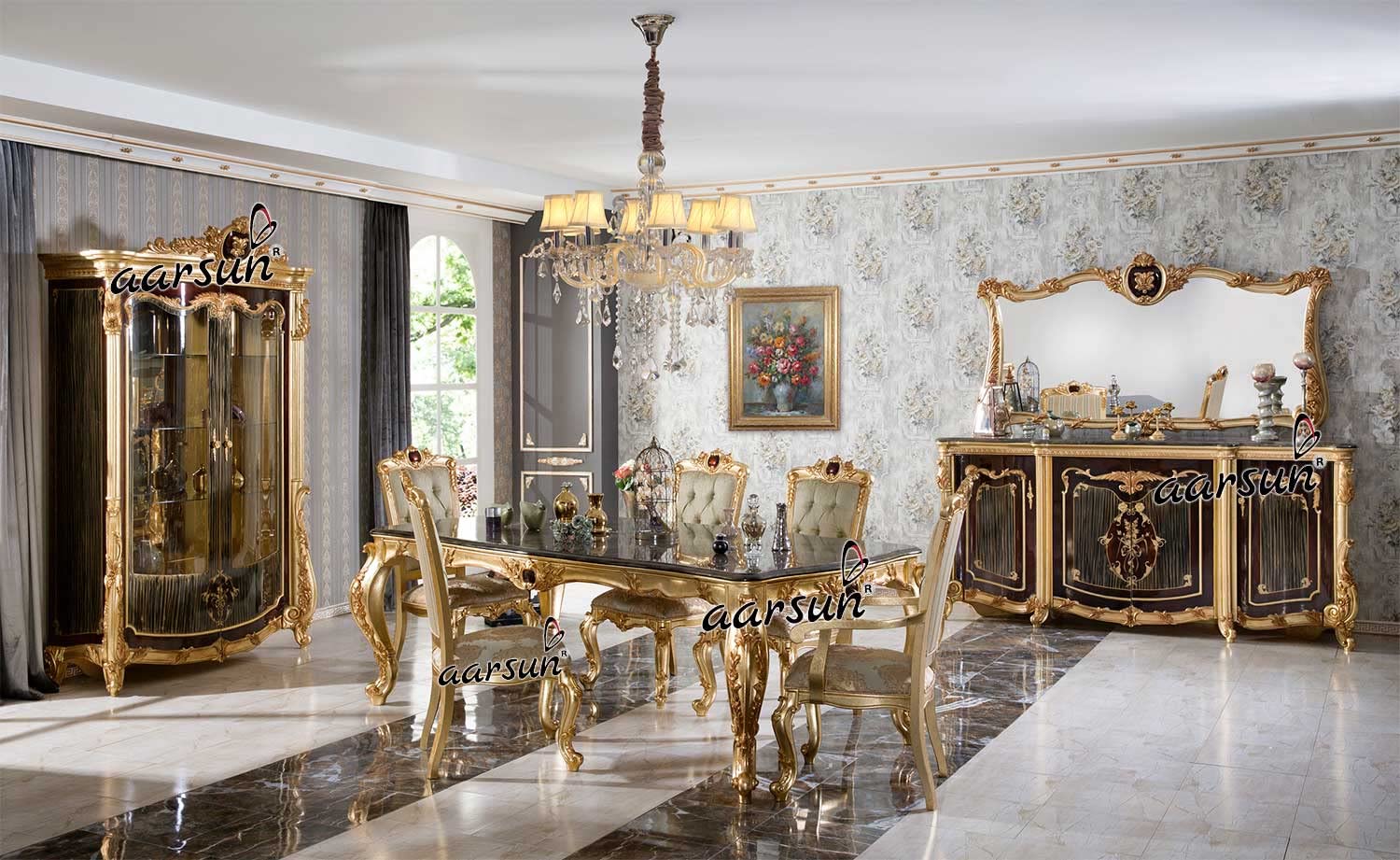 Browse Aarsun double carving exclusive luxury designer dining table with 6 chairs. Designed & Crafted By our skilled artisan. The Luxury Dining Set is designed in teak wood with gold polish as per the customer’s requirement. Aarsun best quality fabric type, seasoned teak wood, and skilled craftsmanship would definitely attract you. Each chair is a masterpiece and beautifully painted. The Smooth Fabric compliments the frame. The best part of the furniture is the dining legs design.