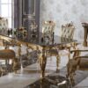 Browse Aarsun double carving exclusive luxury designer dining table with 6 chairs. Designed & Crafted By our skilled artisan. The Luxury Dining Set is designed in teak wood with gold polish as per the customer’s requirement. Aarsun best quality fabric type, seasoned teak wood, and skilled craftsmanship would definitely attract you. Each chair is a masterpiece and beautifully painted. The Smooth Fabric compliments the frame. The best part of the furniture is the dining legs design.