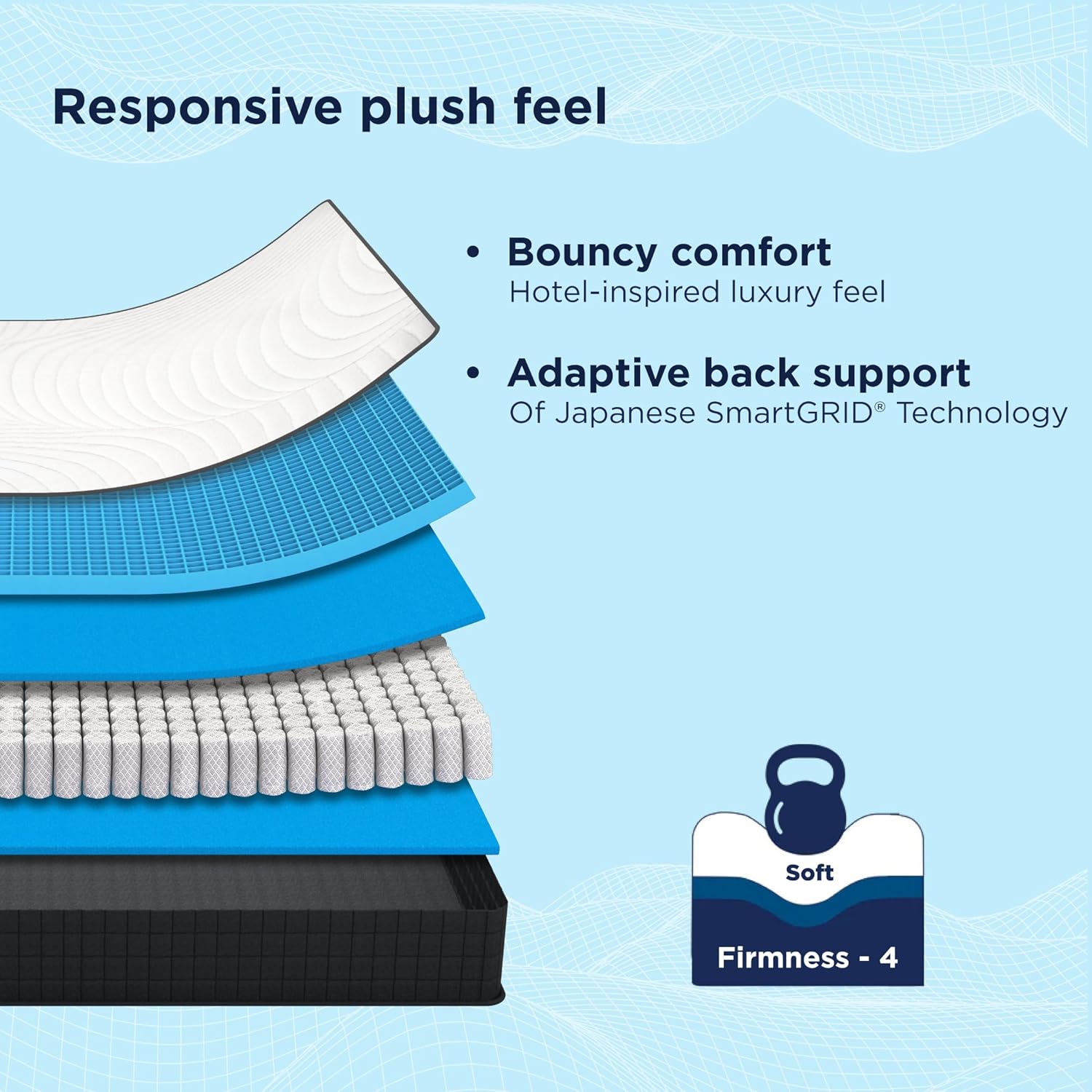 𝗖𝘂𝘀𝗵𝗶𝗼𝗻𝗶𝗻𝗴 𝗛𝗼𝘁𝗲𝗹-𝗹𝗶𝗸𝗲 𝗖𝗼𝗺𝗳𝗼𝗿𝘁: Experience cushioning soft hotel-like luxury at home with our mattress, featuring smartGRID technology and pocketed springs for adequate body support and bouncy comfort.