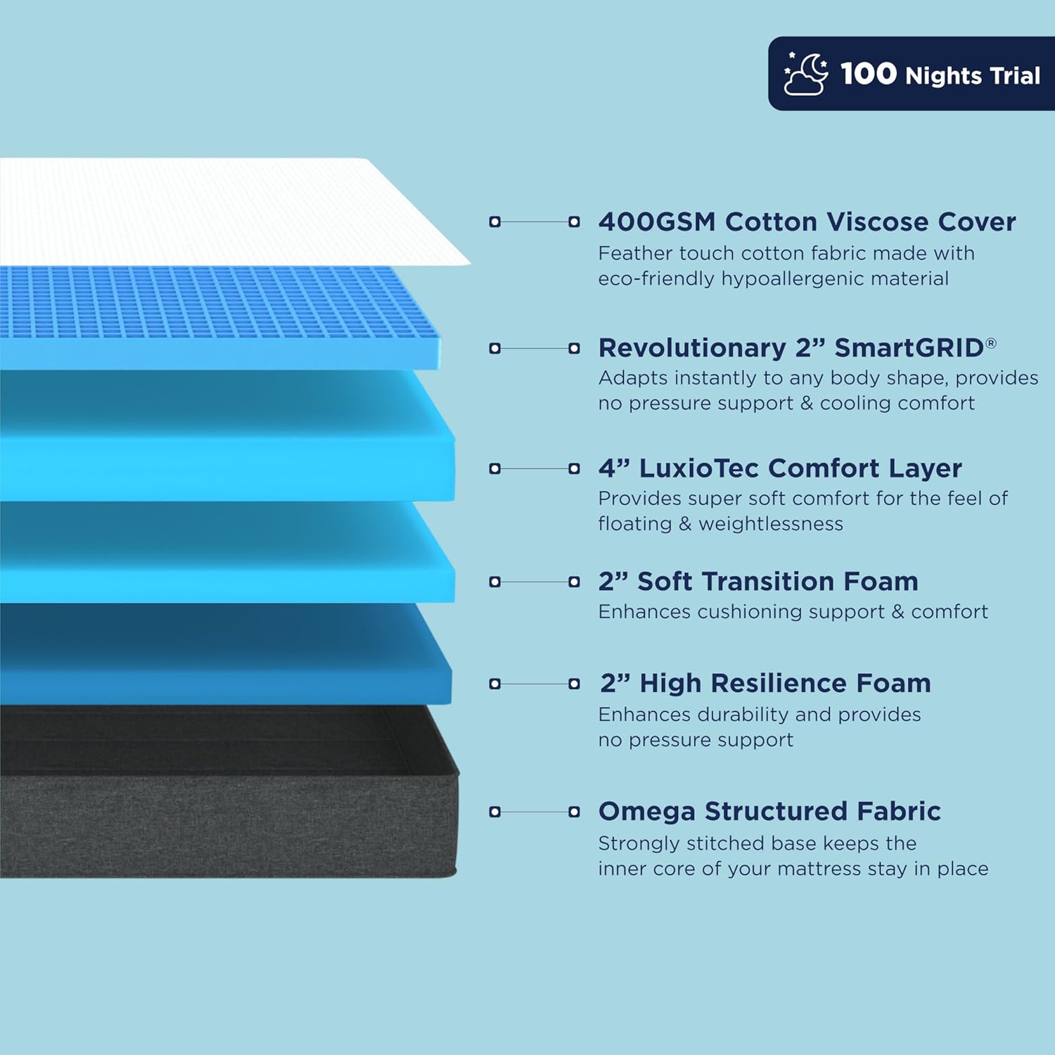 No Pressure Support: The gentle cushioning of the comfort layer of the luxe mattress provide softness for luxury comfort. The SmartGRID and High Resilience foam layer provides adequate body posture support and pressure relief.